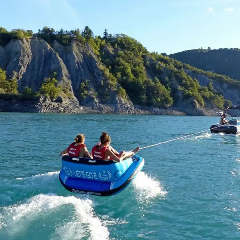 La bouée peut être tirée dans les deux sens. Soit assis comme un canapé ou à genoux pour plus d’action. Haut dossier pour plus de protection pour des enfants. La bouée est entièrement recouverte de nylon et comporte de nombreuses poignées.